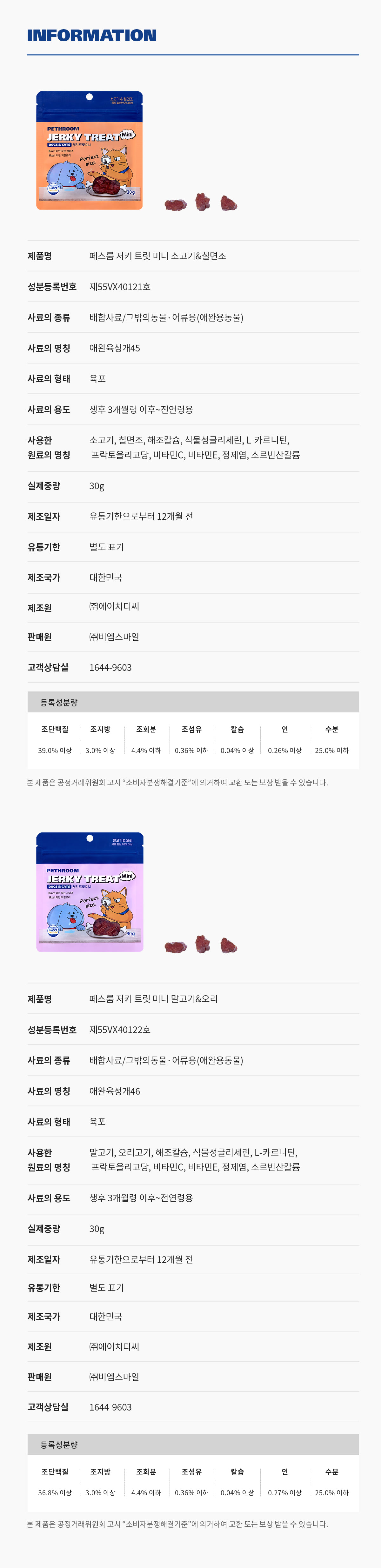 천연 원료를 사용하므로 색, 형태 등이 조금씩 상이할 수 있습니다. 냉장 또는 냉동 보관 후 급여하시는 경우 냉기를 충분히 제거하고 급여하시기 바랍니다.