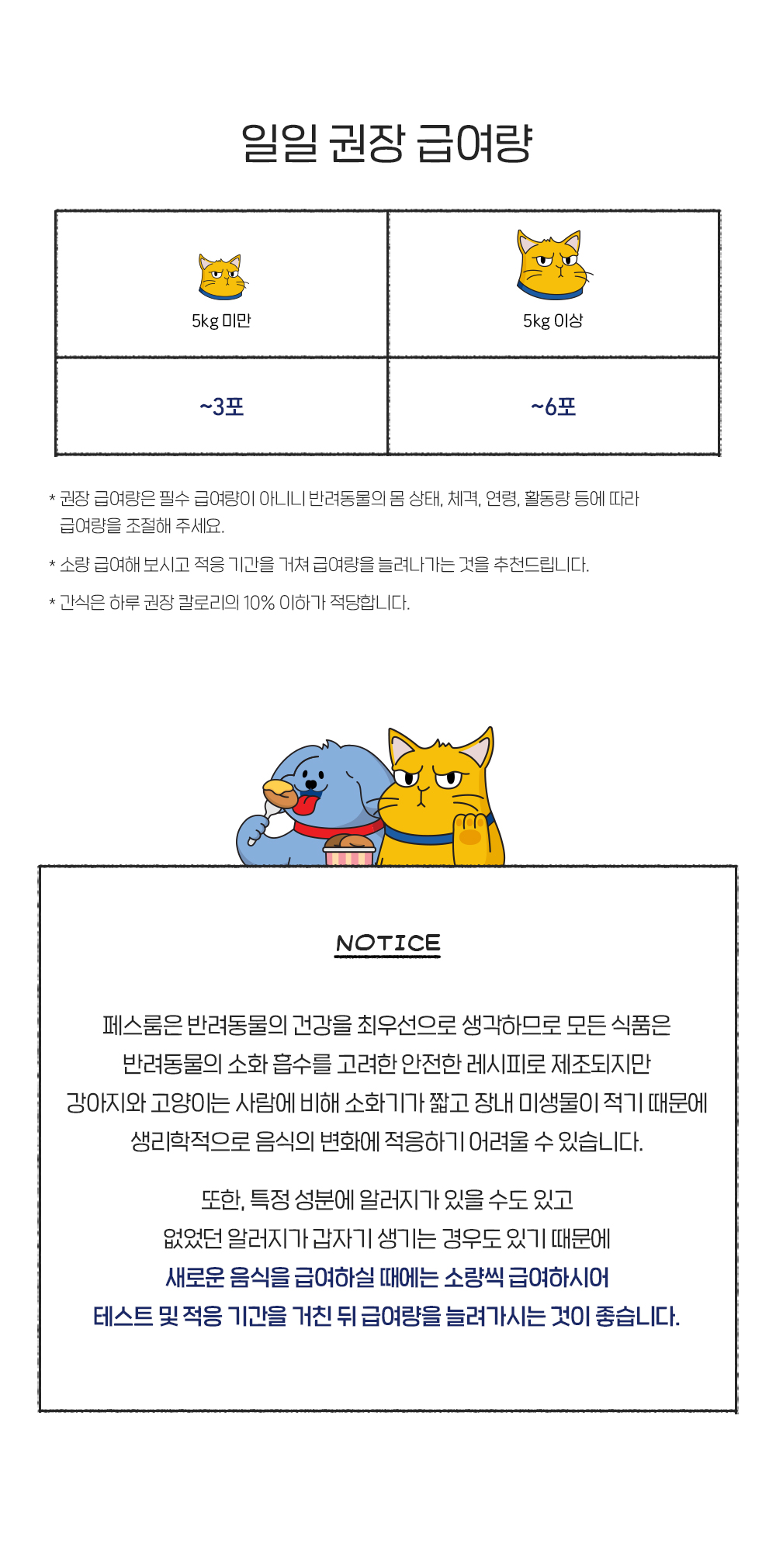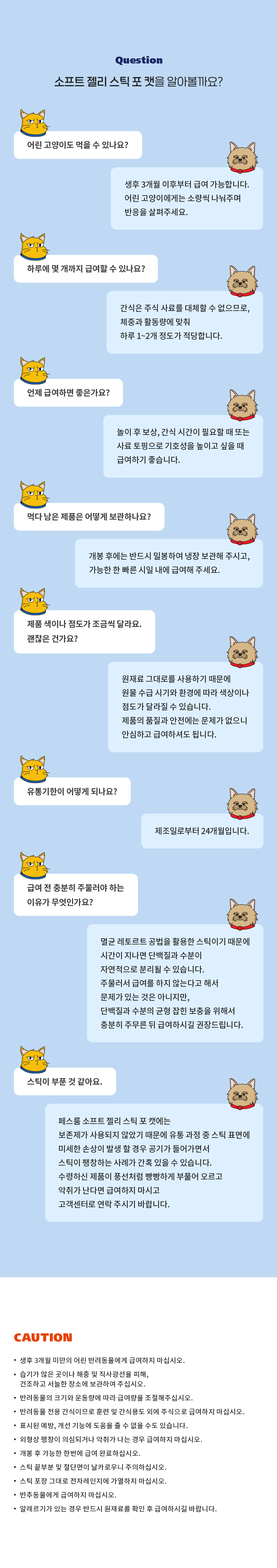 1) 생후 3개월 미만의 어린 반려동물에게 급여하지 마십시오. 2) 습기가 많은 곳이나 직사광선을 피해, 건조하고 서늘한 장소에 보관하여 주십시오. 3) 반려동물의 크기와 운동량에 따라 급여량을 조절해주십시오. 4) 반려동물 전용 간식이므로 훈련 및 간식용도 외에 주식으로 급여하지 마십시오. 5) 표시된 예방, 개선 기능에 도움을 줄 수 없을 수도 있습니다. 6) 외형상 팽창이 의심되거나 악취가 나는경우 급여하지 마십시오. 7) 개봉 후 가능한 한번에 급여 완료하십시오. 8) 파우치 끝부분 및 절단면이 날카로우니 주의하십시오. 9) 파우치 포장 그대로 전자레인지에 가열하지 마십시오. 10) 반추동물에게 급여하지 마십시오. 11) 알레르기가 있는 경우 반드시 원재료를 확인 후 급여하시길 바랍니다.
